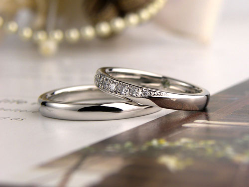 結婚指輪も同じでペアですが、レディスのみダイヤが入って違った物に見えがちですが、形を揃えてペア感を出しています。
