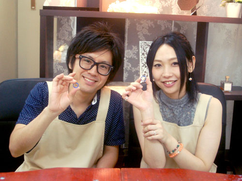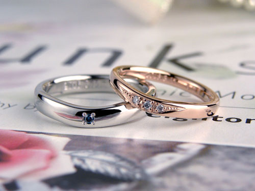 お二人が選んで頂いた手作り結婚指輪のデザインは緩やかなV字型のフォルムにレディスとメンズともにダイヤモンドを埋めこんだデザインです。