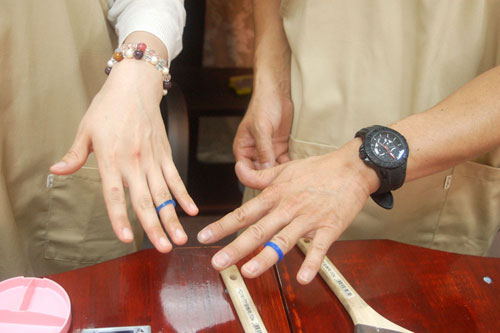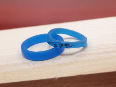 完成したワックス原型は指にはめてしまうと