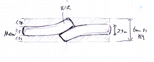 このデザインの結婚指輪の場合は6mm幅のワックスを切り出し、図の斜線部分を削れば形が出来上がってきます。