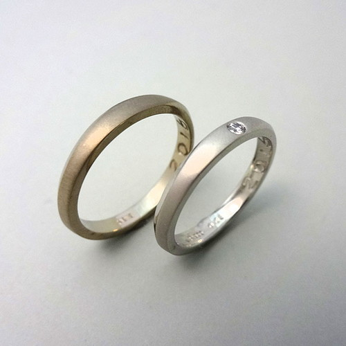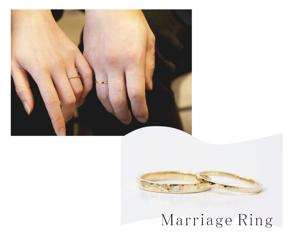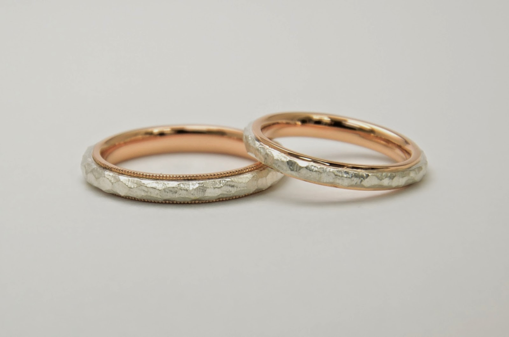「人とは違った指輪を探していて、評判の良いこちらのお店に出会いました。お揃い感もありつつ、お互いのこだわりデザインや自分らしさも取り入れて作りました!」
